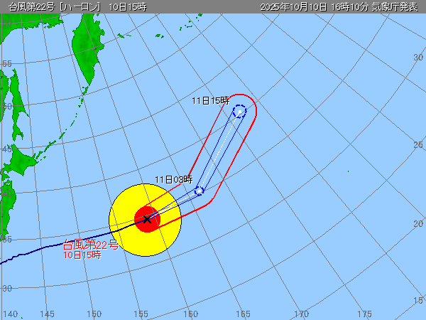 10月10日09時 | 34.4N | 154.8E | 975 | 35 | 全域 165 | 西 500 東 390 |