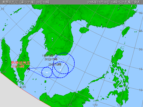 | 11月28日15時 | 4.3N | 104.0E | 1006 | 15 | --- | --- | --- | --- | TD |