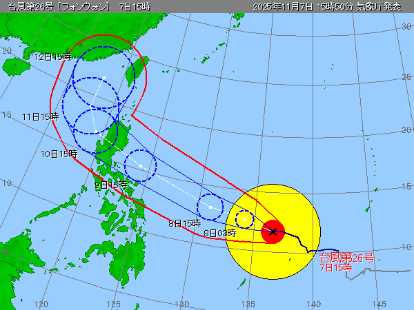 | 11月7日03時 | 11.0N | 138.9E | 980 | 30 | 全域 95 | 全域 440 | --- | --- | STS |
