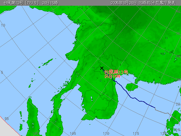 | 8月25日03時 | 18.1N | 108.2E | 950 | 40 | 全域 130 | 全域 390 | --- | 強い | TY |